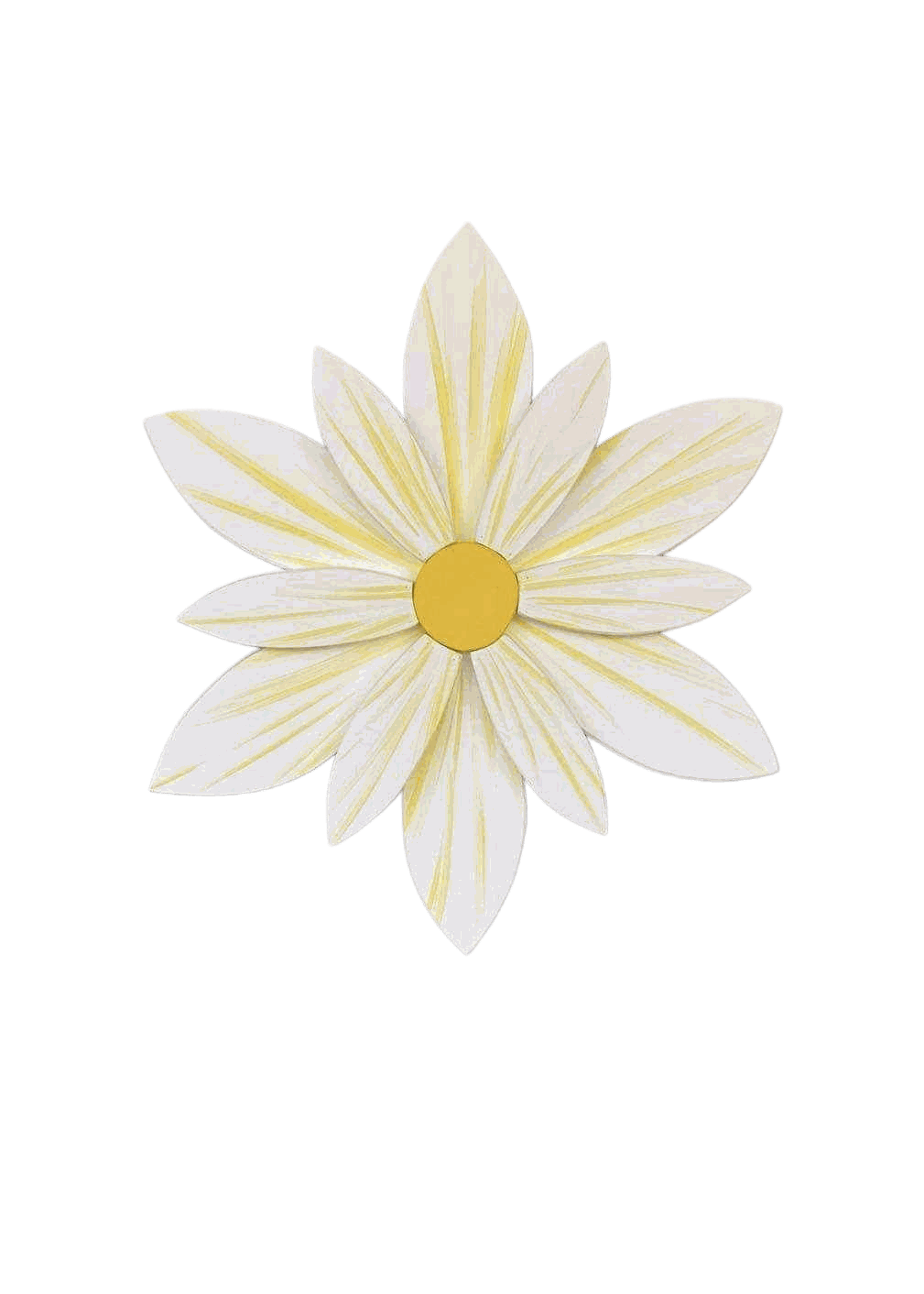 Brighten up your space with this charming wood art door decoration. This white and yellow flower is handcrafted from pine and painted with durable Benjamin Moore Aura paints. Each petal is individually painted for a unique look. The wood art comes with a wire hanger that can be used indoors or outdoors. We use an air nailer to ensure a high-quality product. This wood art flower is available in (22 x 22 inches)
