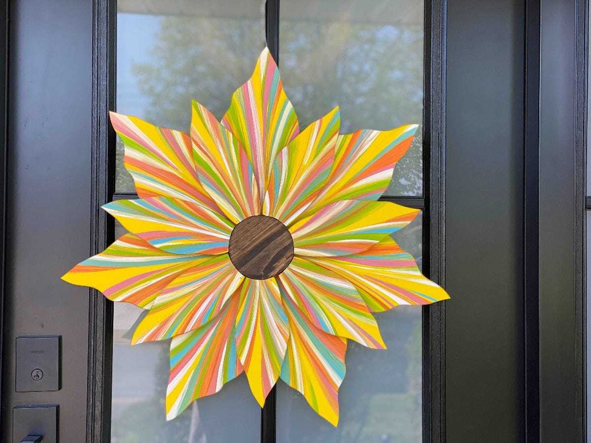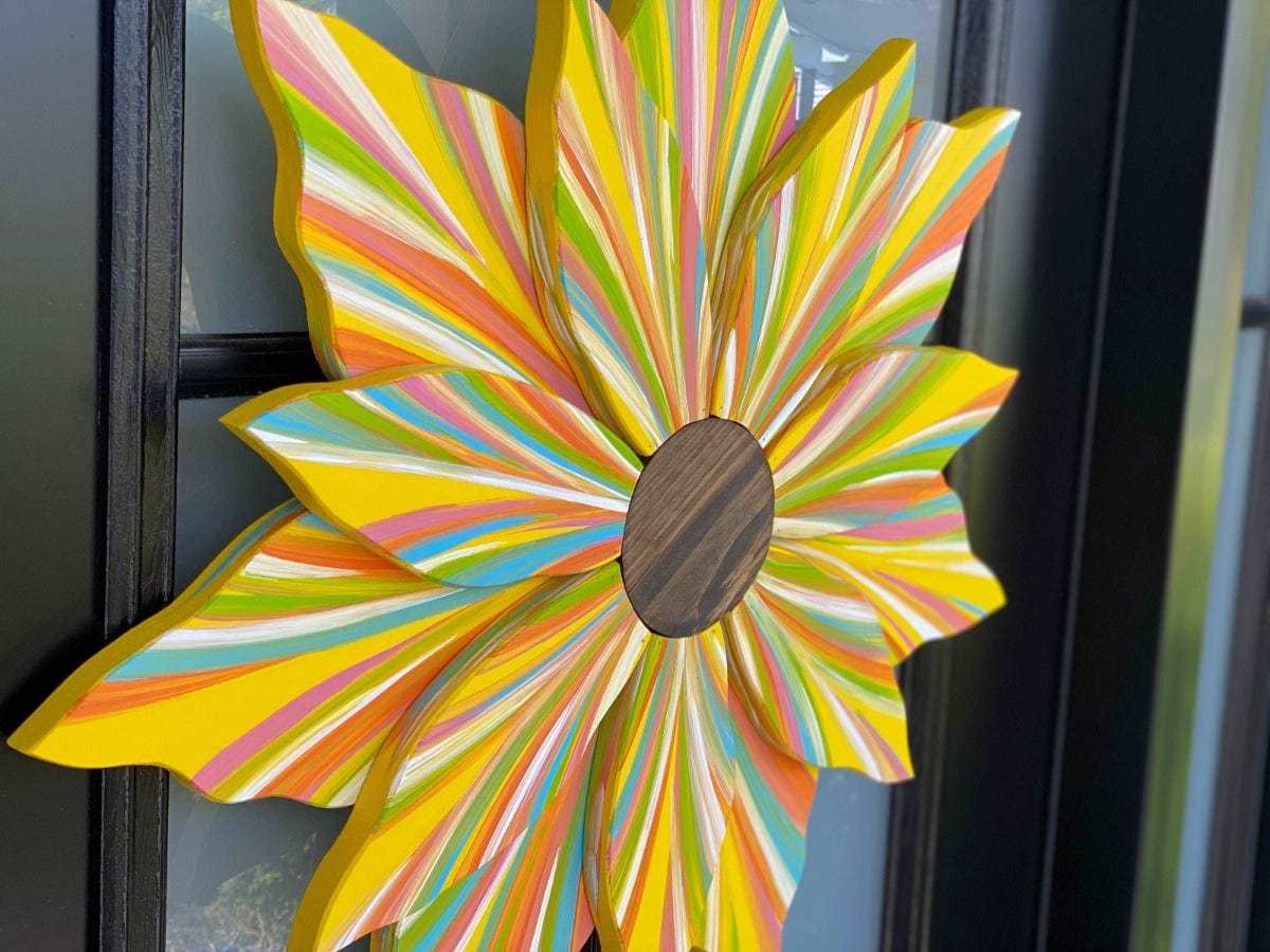 Love is like flowers, always growing Our new 2022 bloom addition, springtime colors bursting at your entryway door. Our handcrafted Love Flower Door Decoration is made from pine and painted with exterior Benjamin Moore Aura paints for long-lasting protection. Each petal is hand-painted for a one-of-a-kind look just for you.