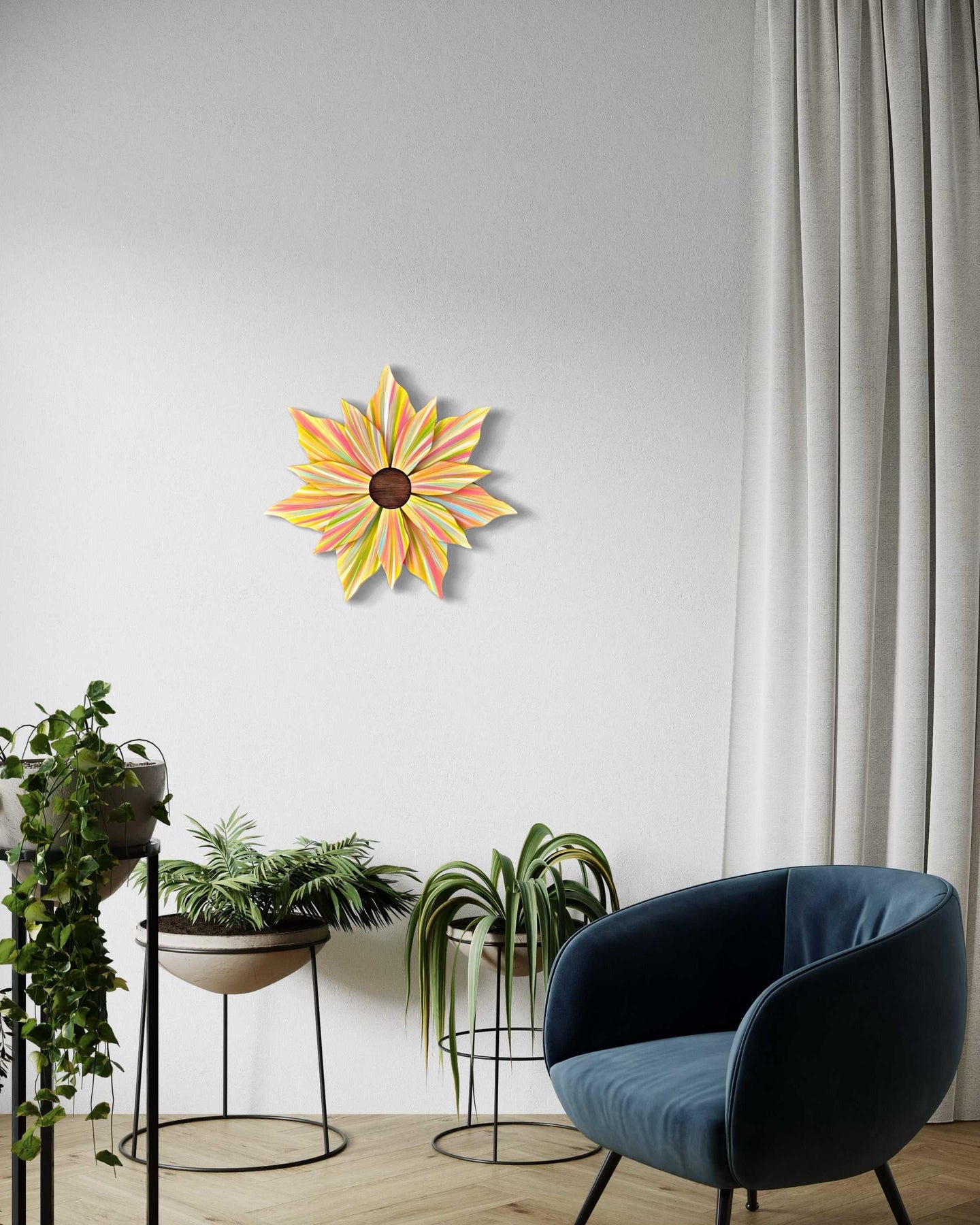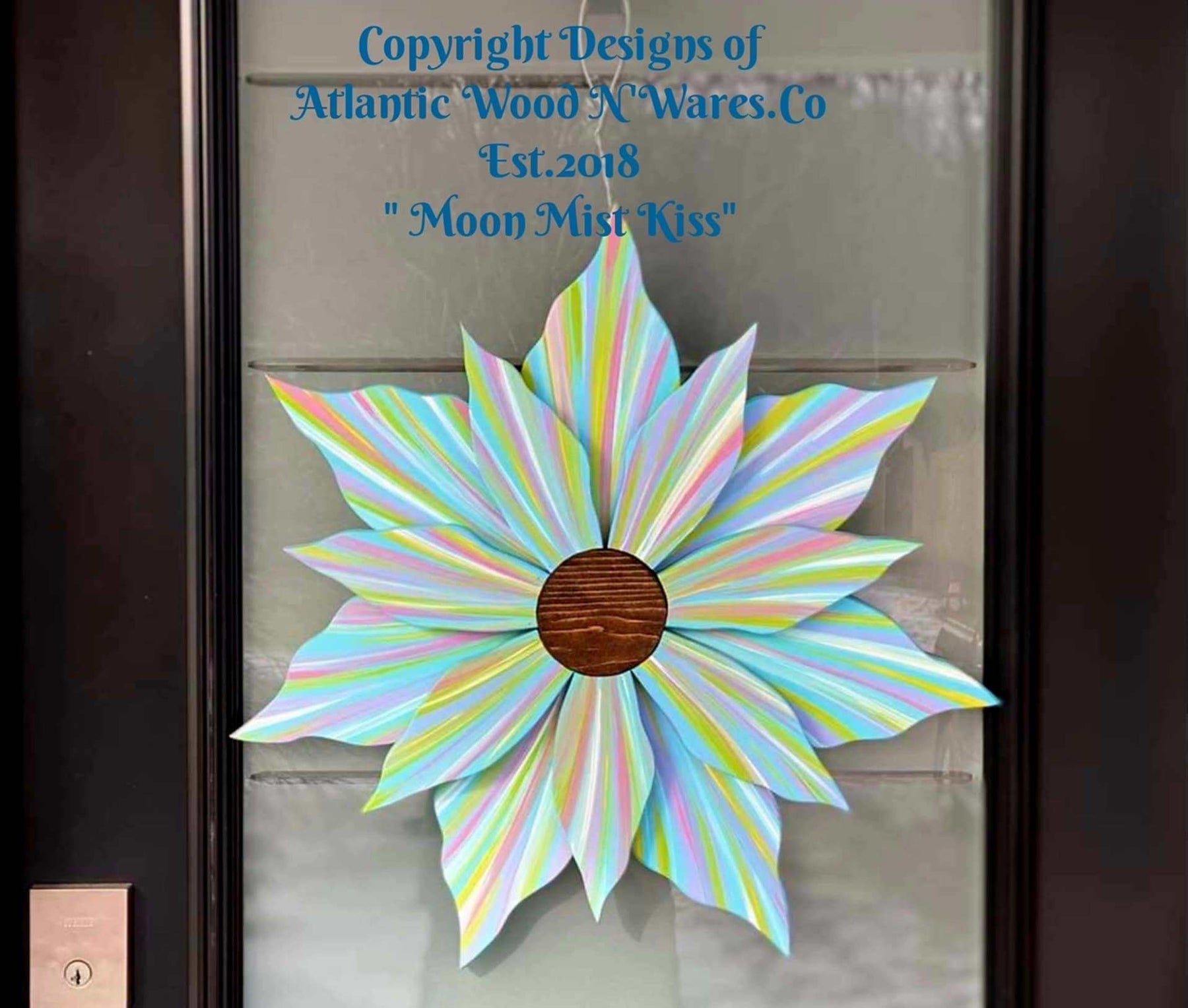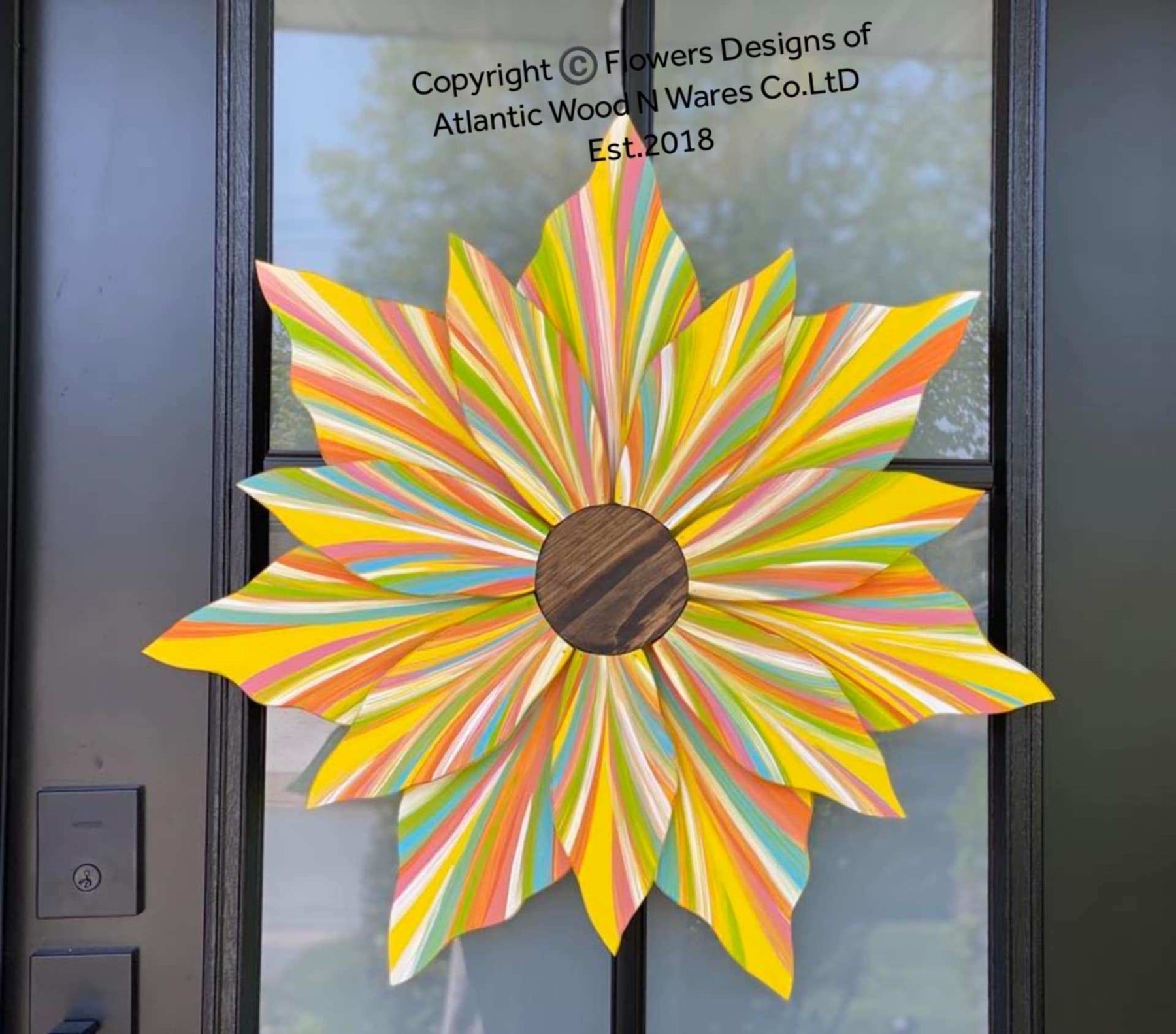 This beautiful decoration adds beauty all year round. It is air-nailed for a strong quality product and can be used for interior or exterior. A wire hanger suitable for outdoor use is attached for easy hanging. Built in Nova Scotia, Canada, this Love Flower Door Decoration measures 22x22 inches. Handcrafted Love Flower Door Decoration Whether you’re looking to decorate your entryway, living room, or bedroom, our wooden flower art pieces are the perfect choice. Handcrafted Love Flower Door Decoration beautiful blueberry lemonade color of the petals is sure to catch your eye, while the gold center adds an elegant touch to any room.