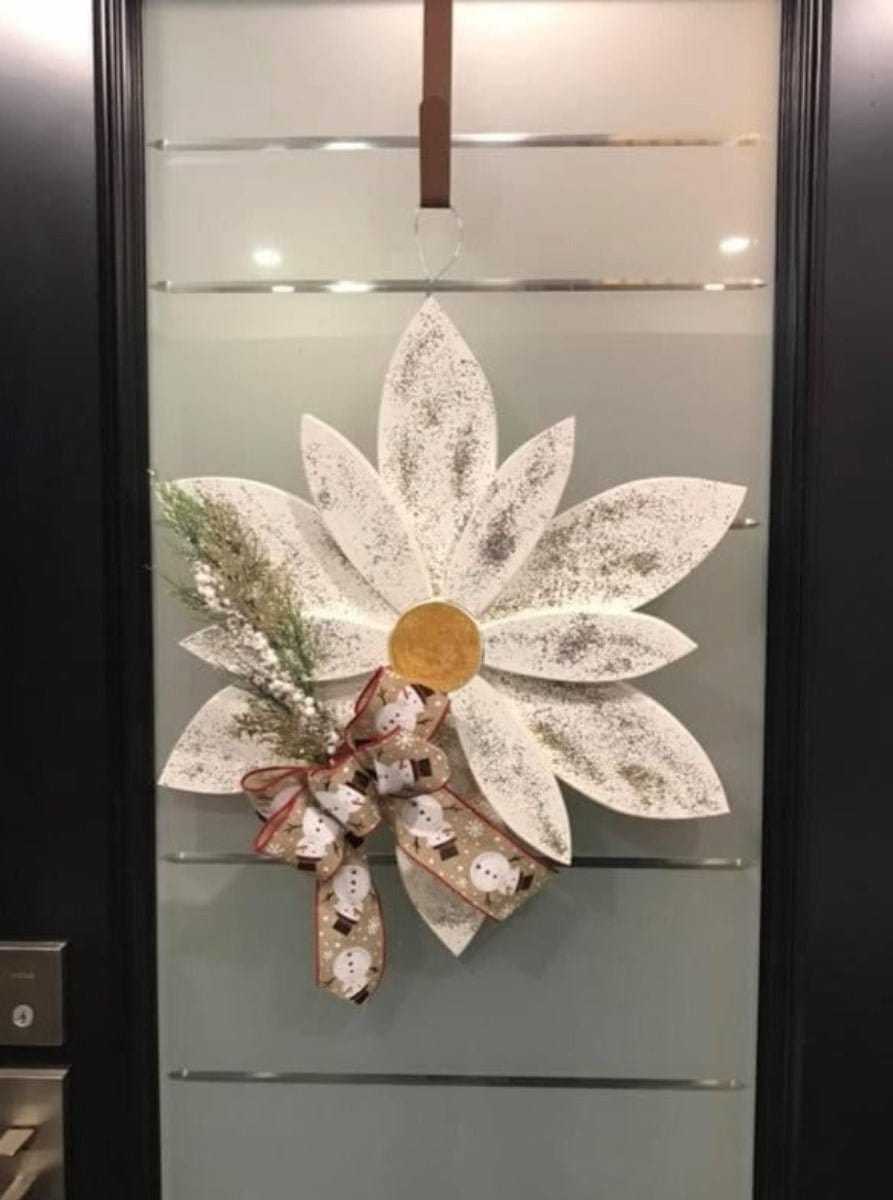 This holiday season, add a touch of elegance to your home with our stunning wooden flower door decoration. Handcrafted from high-quality pine wood and painted with Benjamin Moore Aura paint, this piece is built to last and resist fading and peeling. Each flower petal is individually hand-painted for a unique and beautiful look. The flower comes with a durable wire hanger that can be used indoors or outdoors. (22 inches)
