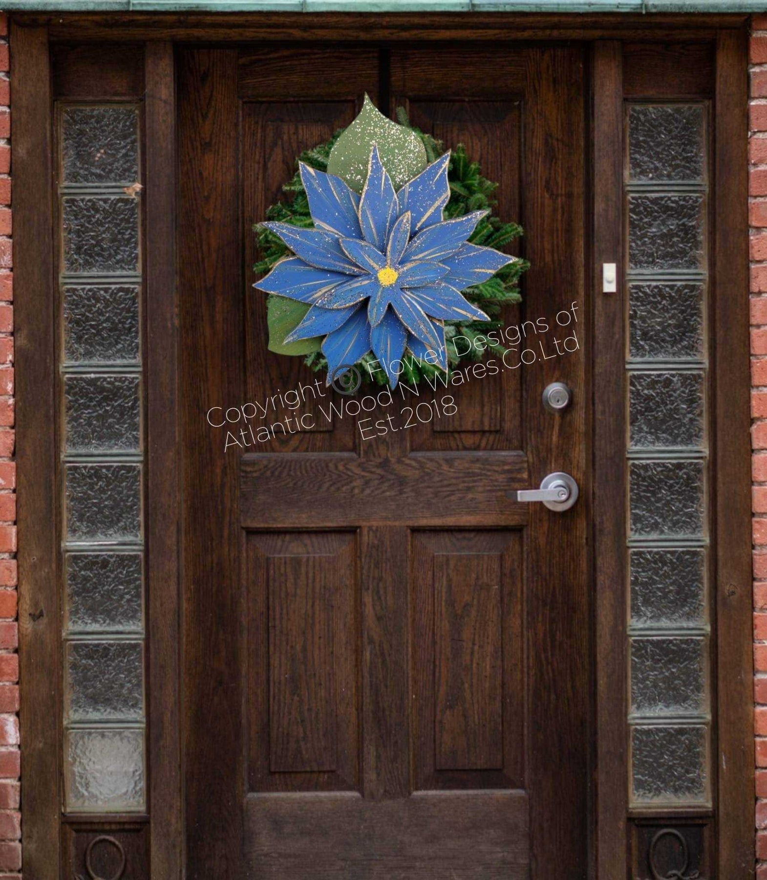 Wooden Poinsettia flower decoration on teal front door, holiday season decor.