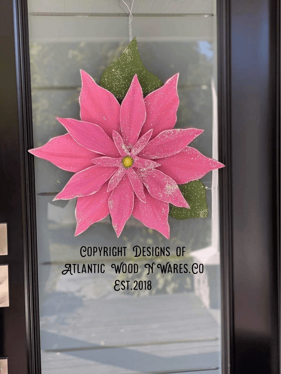 In Christian traditions, the Poinsettia is commonly used as a decoration during the Christmas season. Our wooden flower Poinsettia is a beautiful and unique way to celebrate the holiday season. Each petal’s color and character reflect the symbolism of Poinsettias, with red symbolizing blessings and sacrifice, white symbolizing purity and innocence, pink symbolizing joy and celebration, and yellow symbolizing friendship and well wishes 1. The sturdy wire hanger ensures that your wooden flower can be easily installed on your door or fence or on your inside walls and you can choose from three sizes: Small (10 x 10 inches), Medium (14.5 x 14.5 inches), or Large (24 x 24 inches) 1. This wooden flower will brighten up your door throughout the seasons.