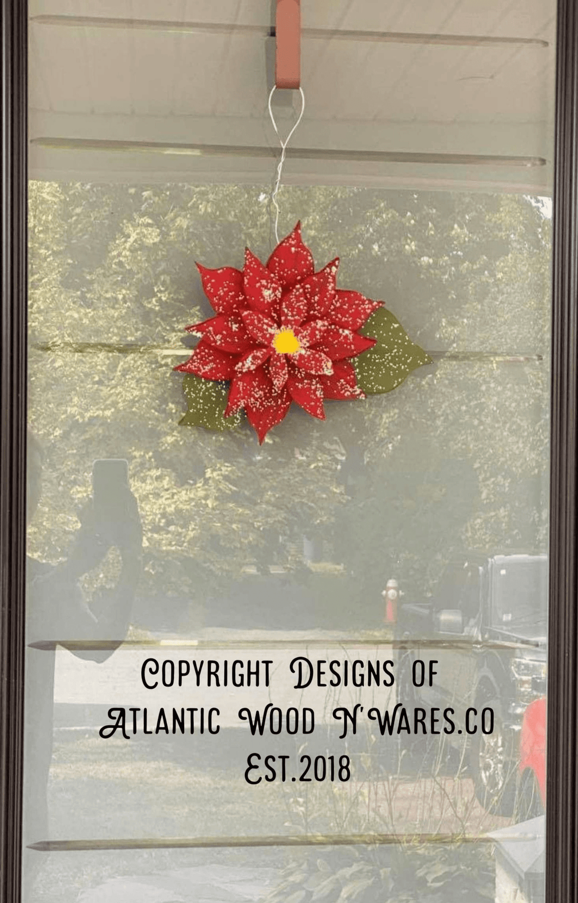 Wooden Poinsettia decoration on front door and patio chair, representing Christmas symbolism and available in three sizes.