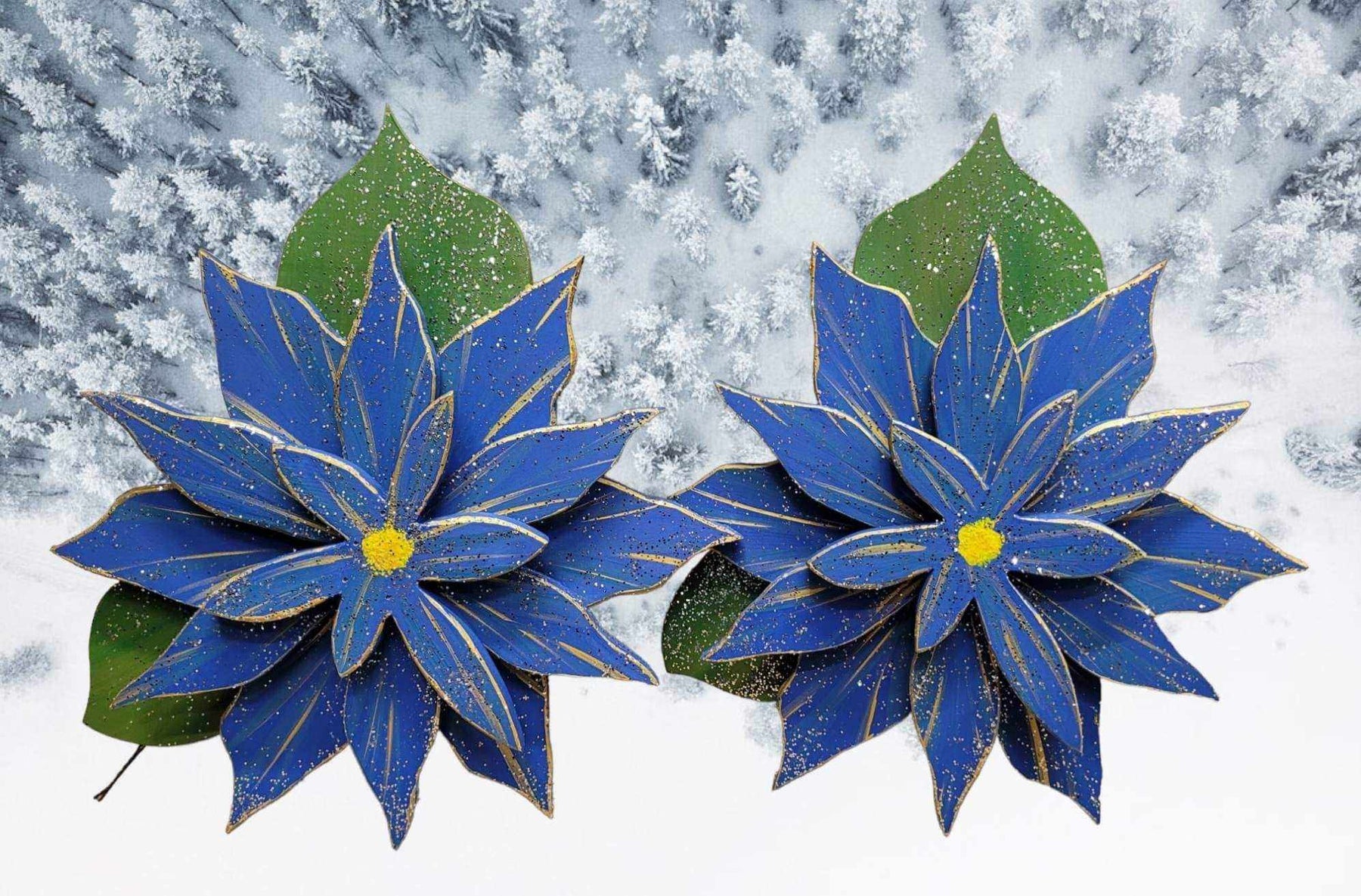 Blue wooden poinsettia flowers with green leaves and snowy background.