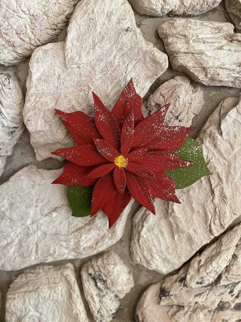 Wooden Poinsettia flowers on display, symbolizing Christmas celebration with vibrant red petals and green leaves.