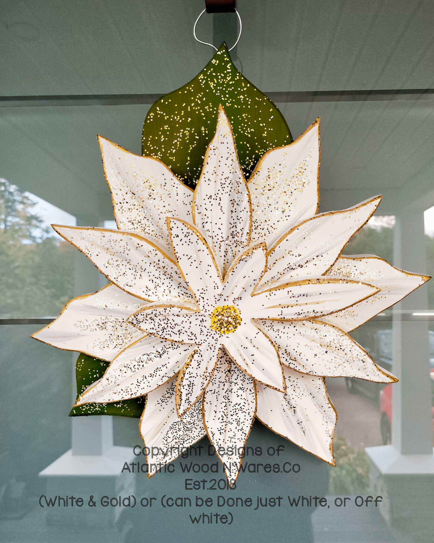 Wooden poinsettia flower in white and gold, designed for holiday decoration, displayed on a door.