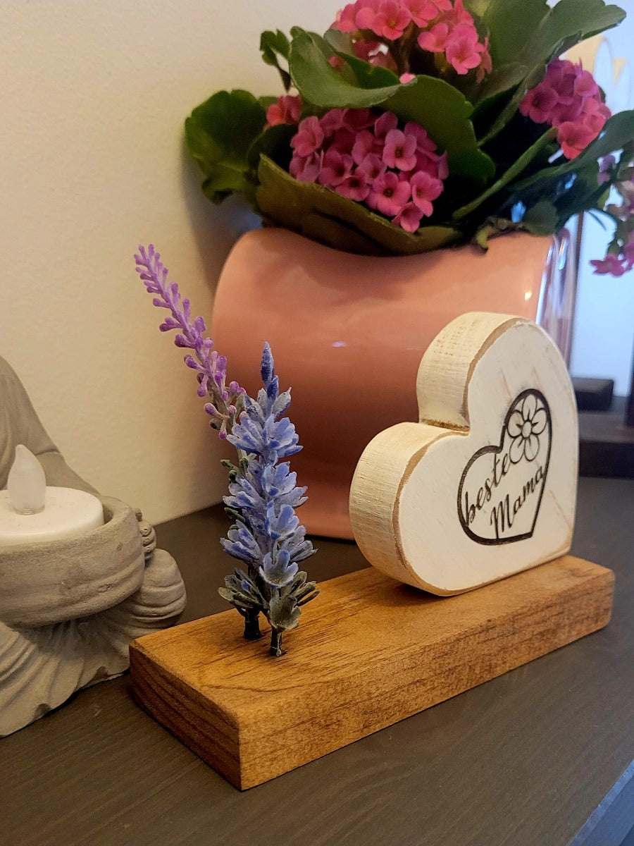 Wooden heart decoration "Beste Mama" on wooden base with lavender sprig, pink flowers in the background.