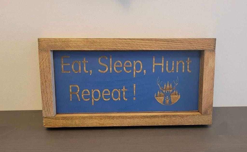 Laser engraved wood sign for hunters featuring the phrase "Eat, Sleep, Hunt, Repeat" with deer and forest design.
