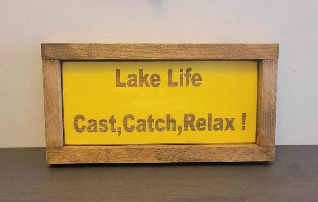 Laser engraved wood sign with "Lake Life, Cast, Catch, Relax" message in rustic frame.