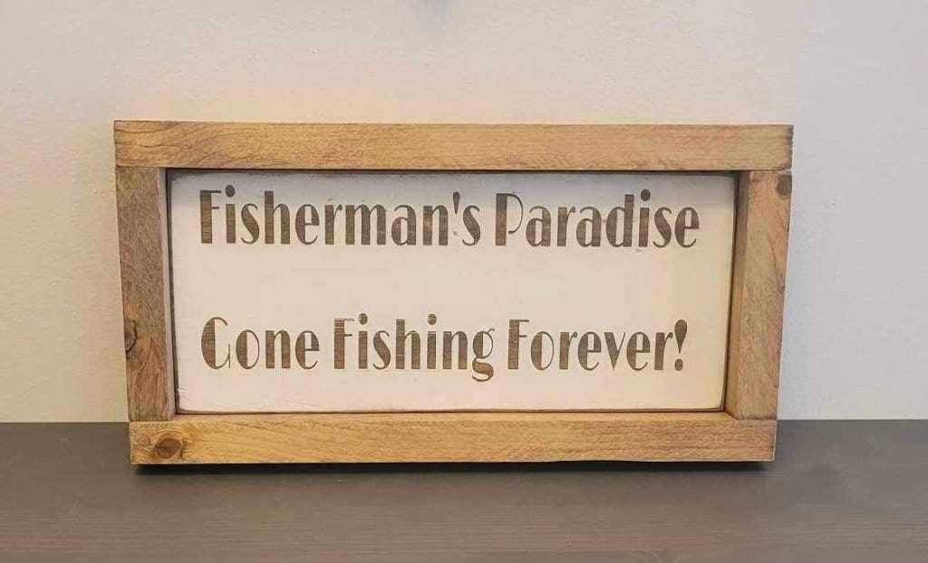 Laser engraved wood sign with "Fisherman's Paradise, Gone Fishing Forever" message for outdoor enthusiasts.