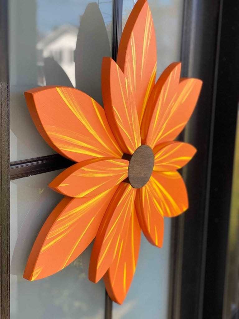Handcrafted orange sunset wood flower door decoration with yellow streaks.