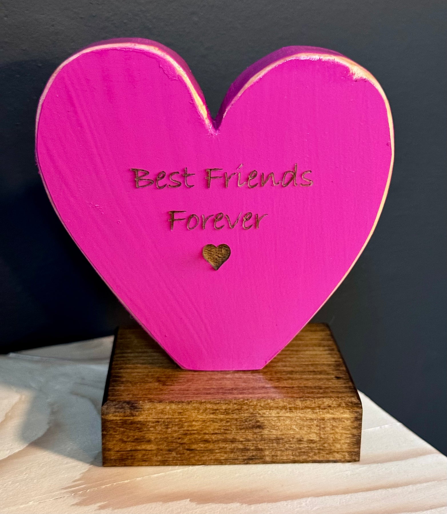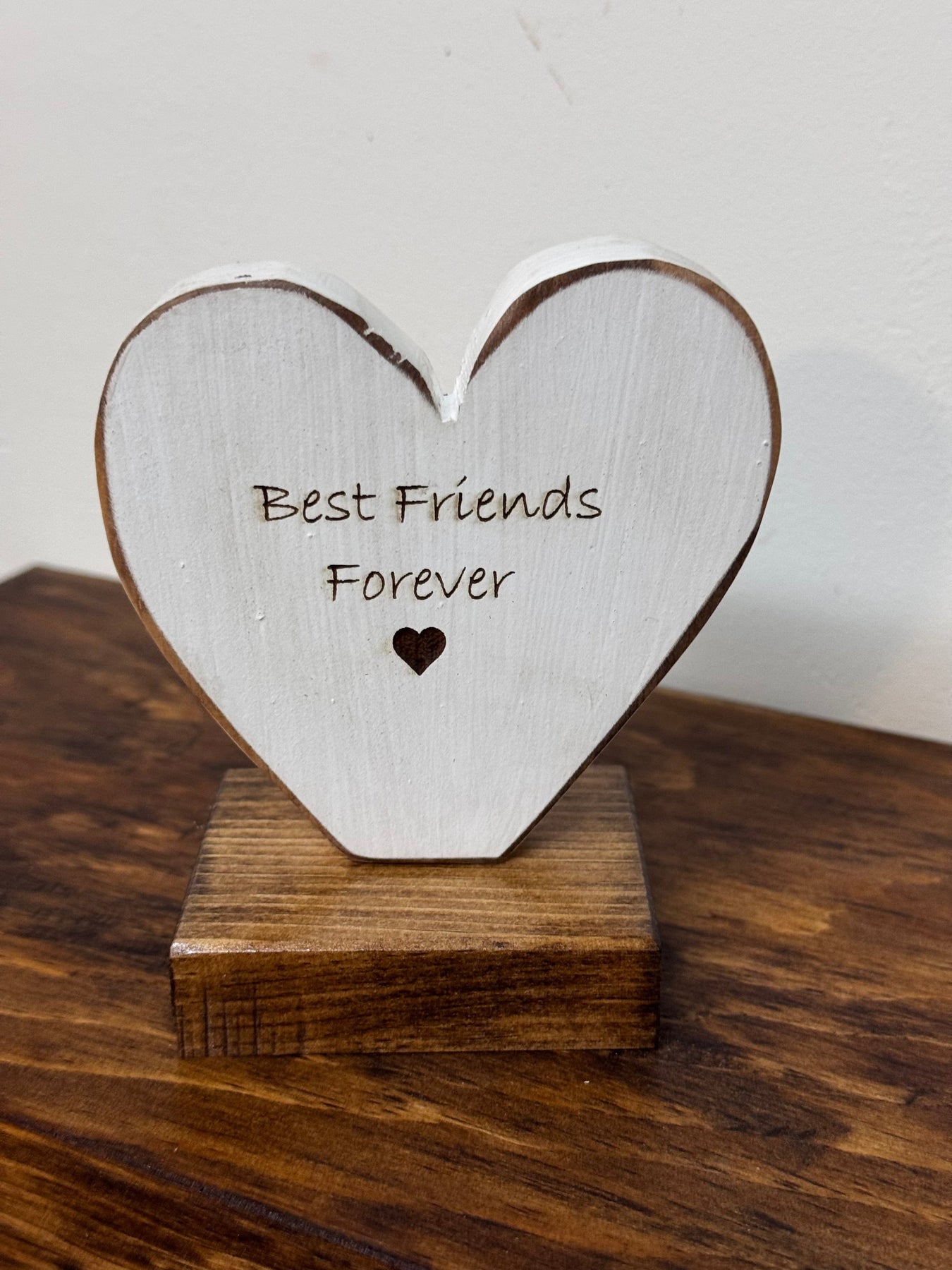Want a different saying or specific colour to match your home décor? We love creating custom pieces! Just message us with your request and we'll work with you to create the perfect personalized heart shelf sitter.