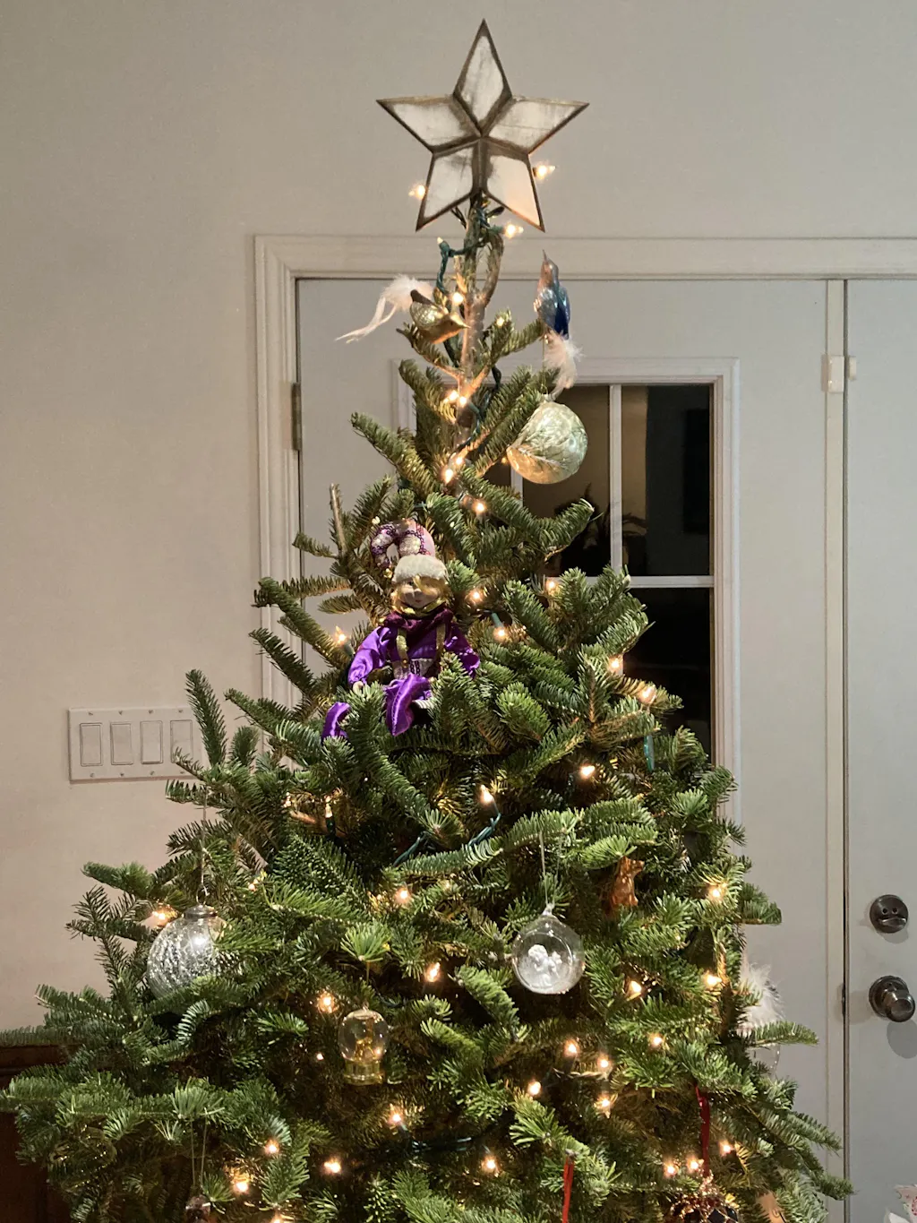 Rustic artisan-made wooden star as a Christmas tree topper on a snowy tree.
