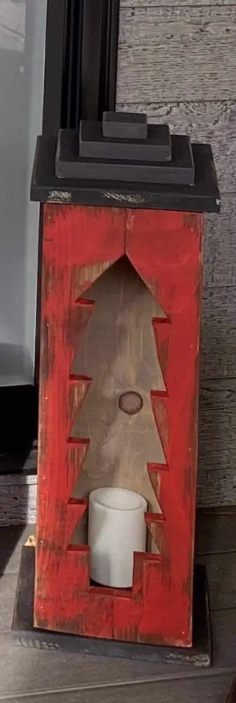Handcrafted wooden lantern with tree cutout design and red accents.