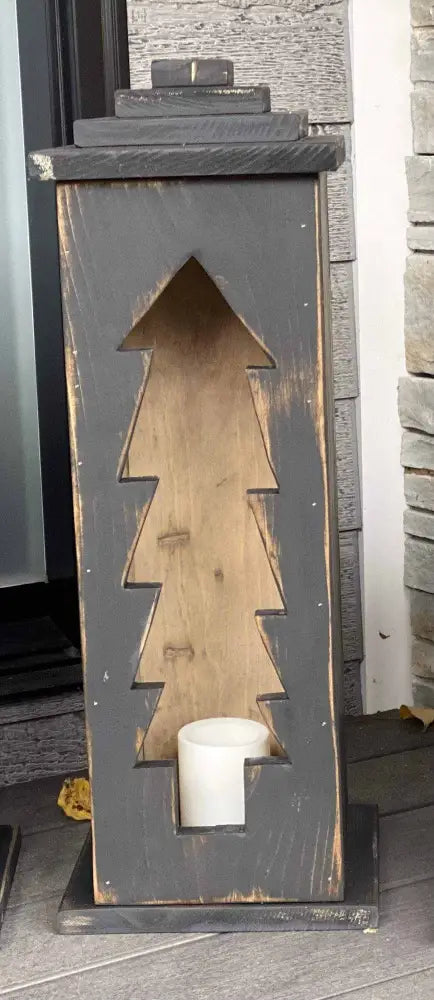Handcrafted wooden lantern with tree cutout design on a porch.