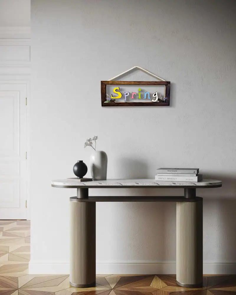 Handmade wooden sign with colorful spring letters, featuring rope attachment for easy hanging.