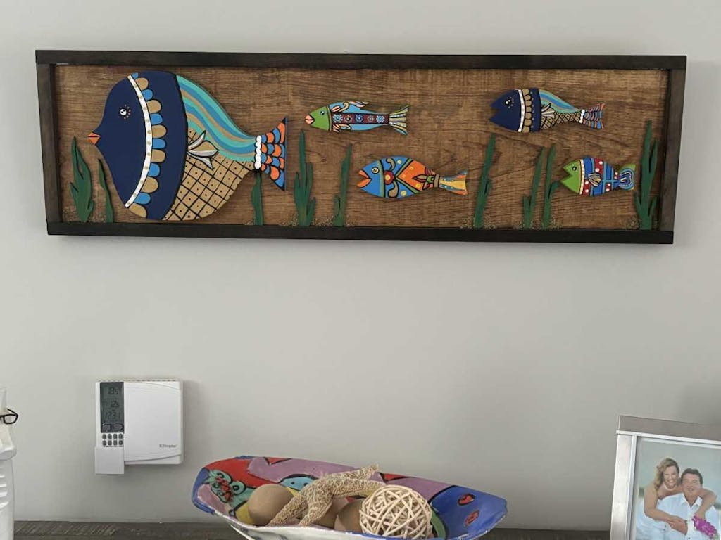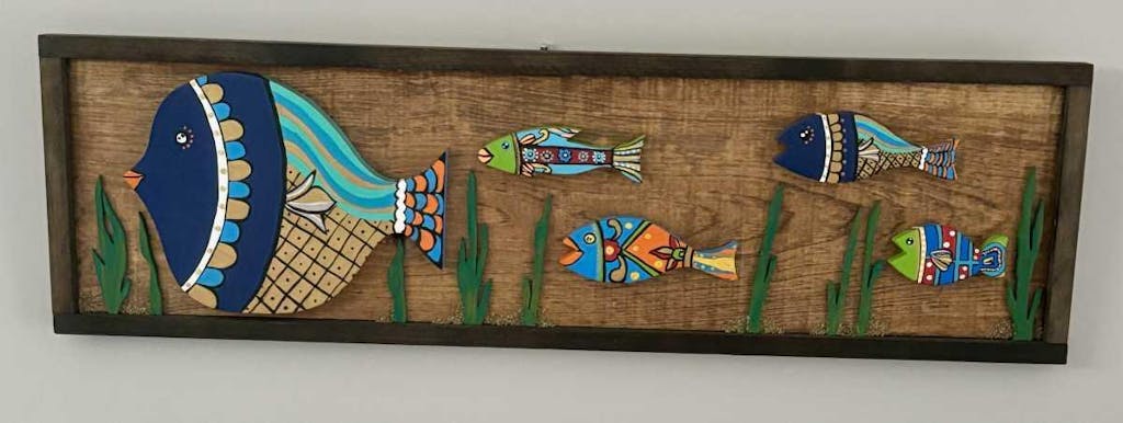 Handmade wooden fish wall art in kitchen, colorful and intricate design, 37.5" x 10.75".